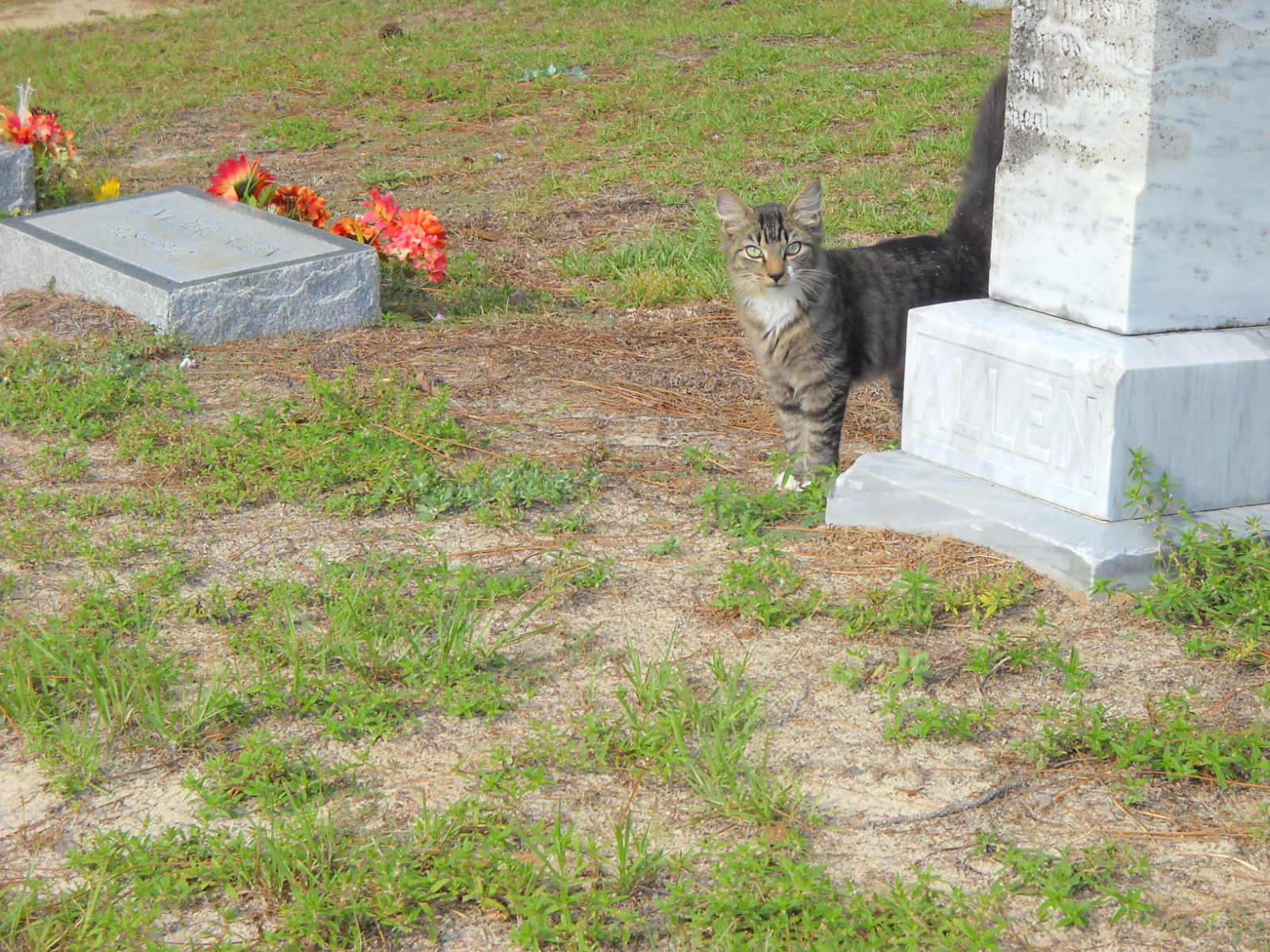 Of course I was assuming that she wasn’t at least noshing on whatever little rodents lived in the area. She maintained a distance of about two rows from me, leisurely strolling along the crabgrass, and gingerly stepping on the heads of artificial flowers that had abandoned those to whom they were dedicated.